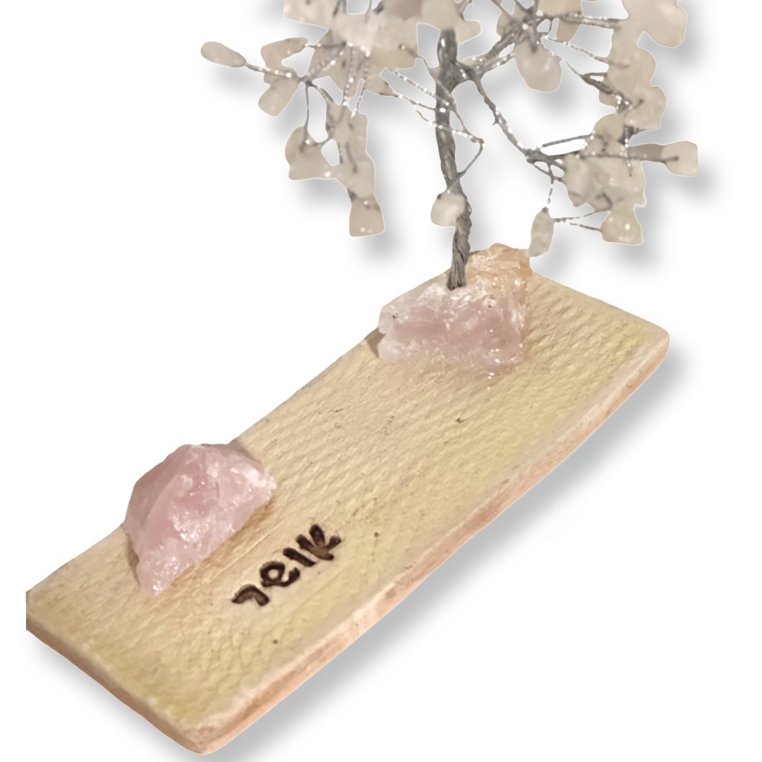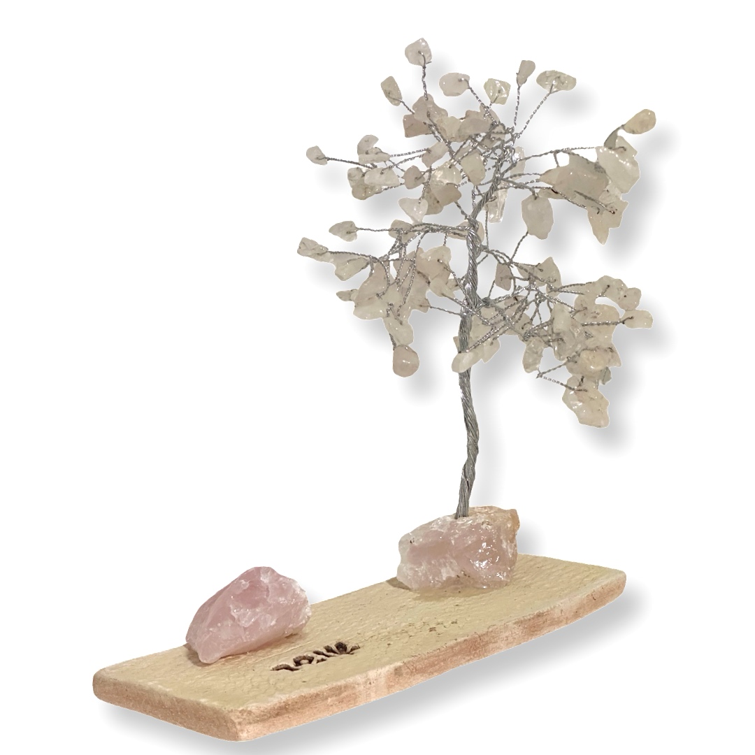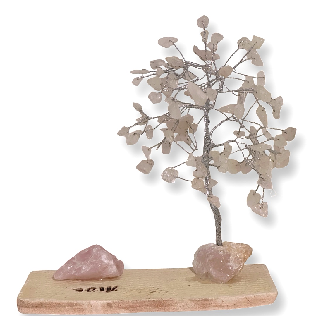 - עץ משובץ באבני רוז קוורץ טבעיות, המחוברות לענפים דמויי תיל היוצאים מבסיס עץ-