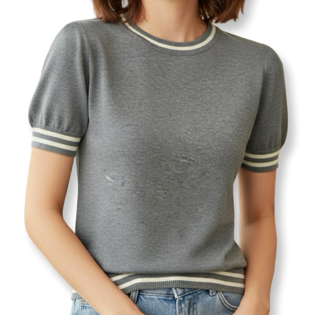חולצת סריג אופנתית קצרה עם פסי רטרו בצווארון צבע אפור ג׳וקלייר