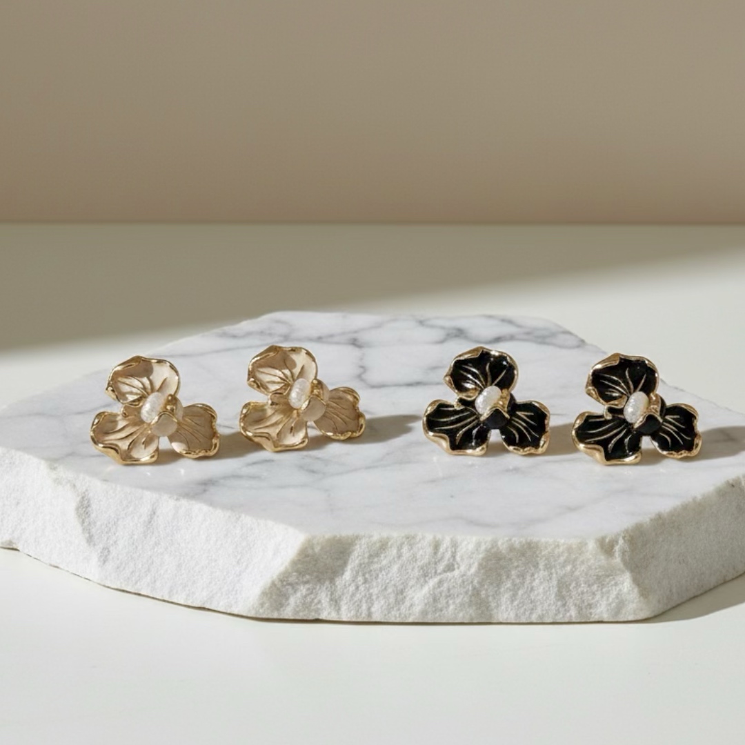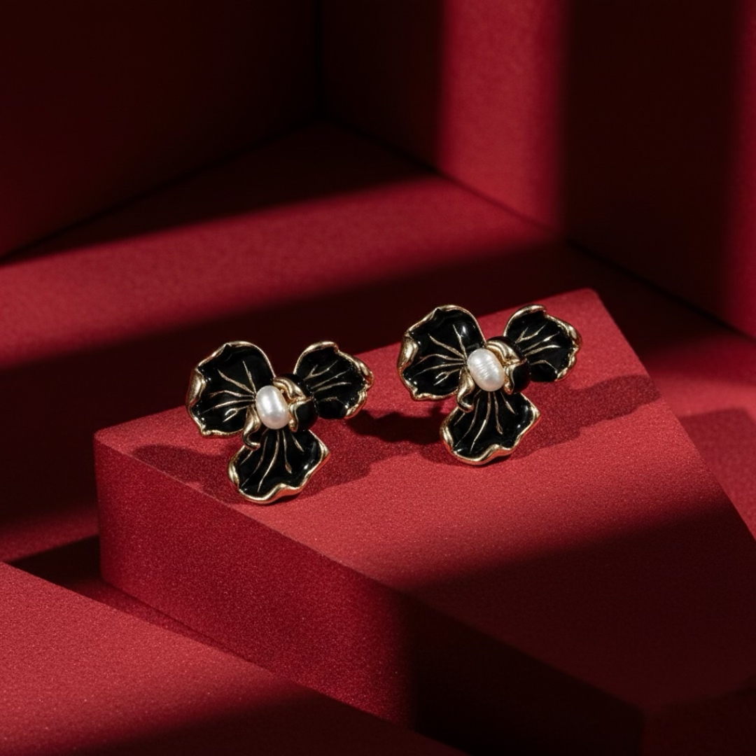 עגילי פרח אמייל ״פנינה״ צבע שחור ג'ויה
