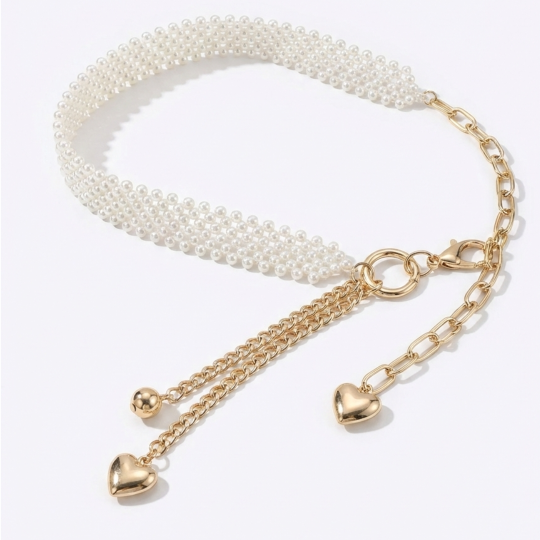 חגורת מותן משובצת פנינים עם שרשראות זהב ותליוני לבבות ליאלב
