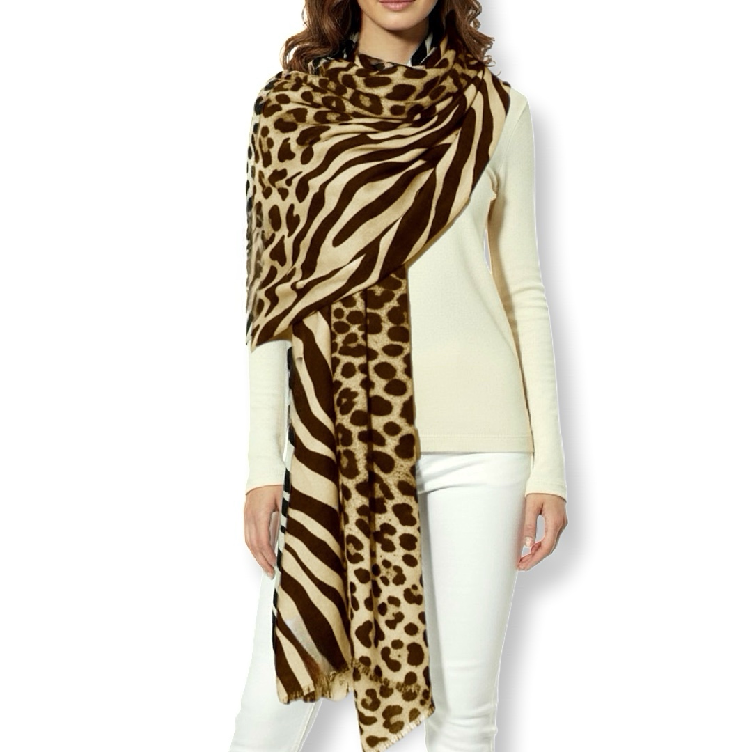 צעיף/שאל גדול זברה-נמר דוצדדי יוקרתי בגווני חום קיארה